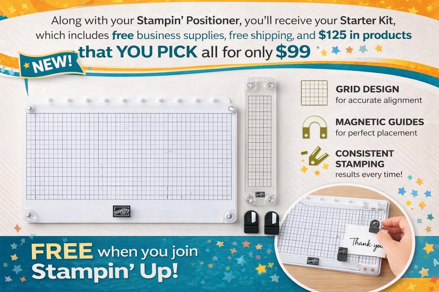 So Exciting. I hope you will stop by my Online Facebook post tonight at 8:05 PM CST. I will be demonstrating the New Stampin’ Positioner tool. Very easy to use, and it’s free when you join Stampin’ Up!